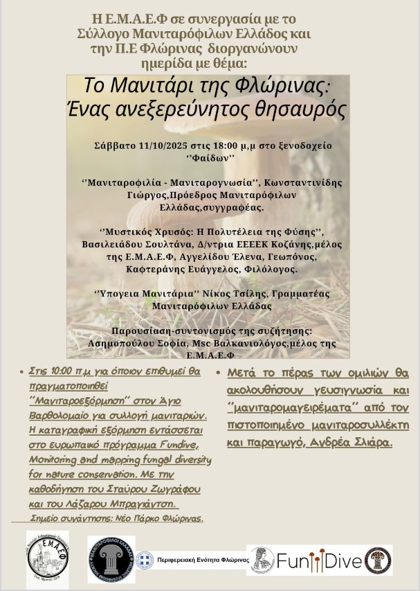 Η Εταιρεία Μελετών Ανθρωπιστικών Επιστημών Φλώρινας (ΕΜΑΕΦ), σε συνεργασία με τον Σύλλογο Μανιταρόφιλων Ελλάδος, διοργανώνει το Σάββατο 11/10 και ώρα 6 μ.μ στο ξενοδοχείο Φαίδων μια εξειδικευμένη αυτή τη φορά ημερίδα αφιερωμένη στο μανιτάρι, ένα στοιχείο που συνδέει τη φύση, την παράδοση, την κοινωνία και τη γνώση. Η επιλογή του θέματος δεν έγινε τυχαία. Το μανιτάρι, πέρα από ένα αγαθό της Φλωριναίας γης υψηλής διατροφικής αξίας, αποτελεί έναν πολιτισμικό και κοινωνικό δείκτη, που συνδέεται με την τοπική ταυτότητα της περιοχής, την οικολογία, την εκπαίδευση καθώς τη βιώσιμη ανάπτυξη. Στο πλαίσιο της εκδήλωσης αυτής θα έχουμε τη δυνατότητα να γνωρίσουμε όλα όσα συνδέουν το μανιτάρι με τη Φλώρινα αλλά και να παρακολουθήσουμε πως αυτό μπορεί να αξιοποιηθεί και εκπαιδευτικά στο πλαίσιο ενός προγράμματος μιας εικονικής επιχείρησης. Το πρωί της ίδιας μέρας, για όσους ενδιαφέρονται θα προηγηθεί μανιταροεξόρμηση στο βουνό, πληροφορίες της οποίας αναγράφονται εντός της πρόσκλησης. Στην ημερίδα, πέρα από τις εισηγήσεις, θα ακολουθήσει δειγματισμός μανιταριών και μαγειρική από τα μέλη του Συλλόγου Μανιταρόφιλων ενώ όλοι θα έχουμε τη δυνατότητα να γευτούμε τις προτάσεις τους.