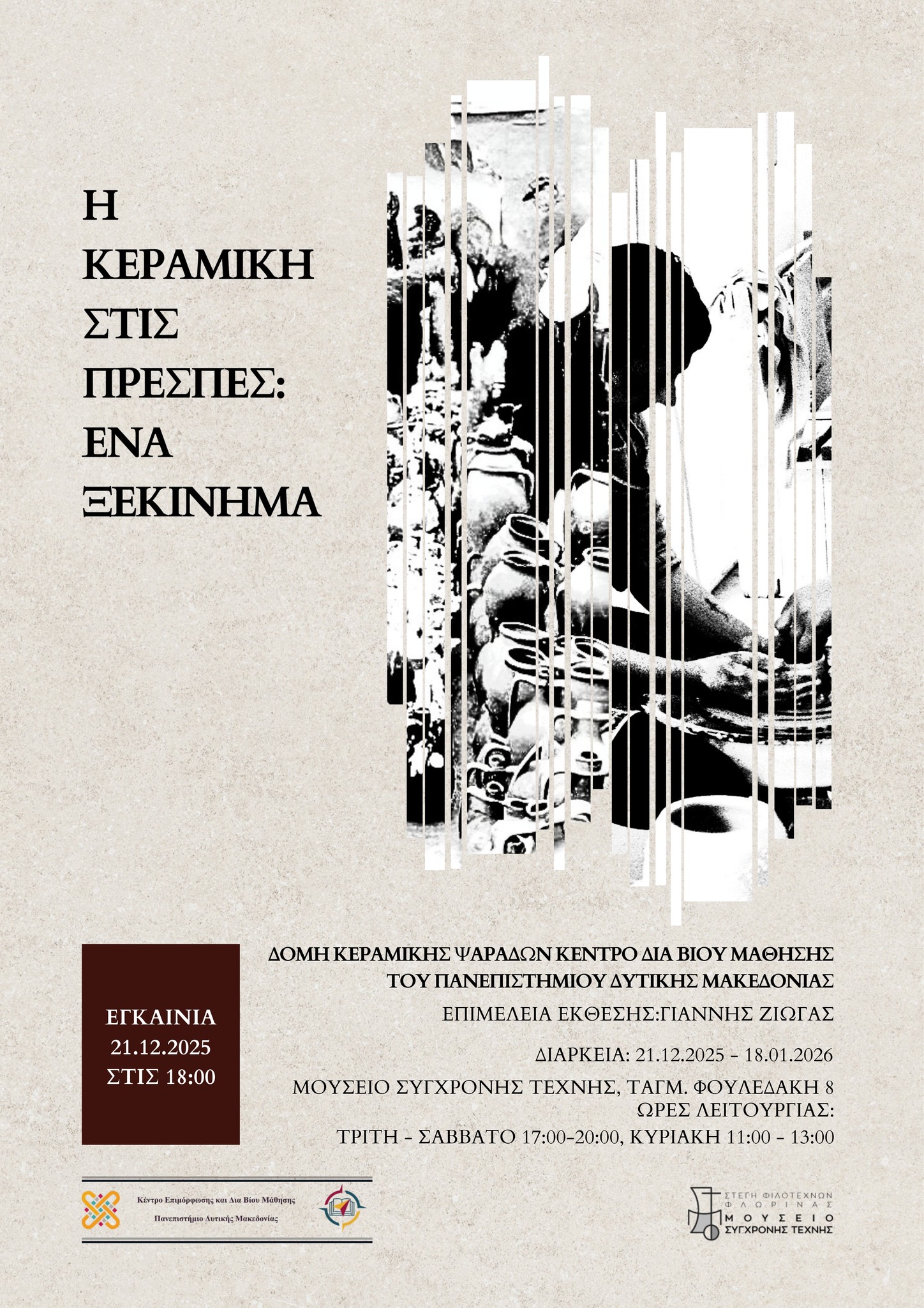 Στο πλαίσιο των παράλληλων δράσεων της έκθεσης Η Κεραμική στις Πρέσπες: ένα ξεκίνημα, θα πραγματοποιηθεί ξενάγηση από τον επιστημονικά υπεύθυνο του πιλοτικού προγράμματος, κ. Γιάννη Ζιώγα, την Πέμπτη 15 Ιανουαρίου 2026 και ώρα 19:00 στο Μουσείο Σύγχρονης Τέχνης Φλώρινας, Ταγμ. Φουλεδάκη 8.