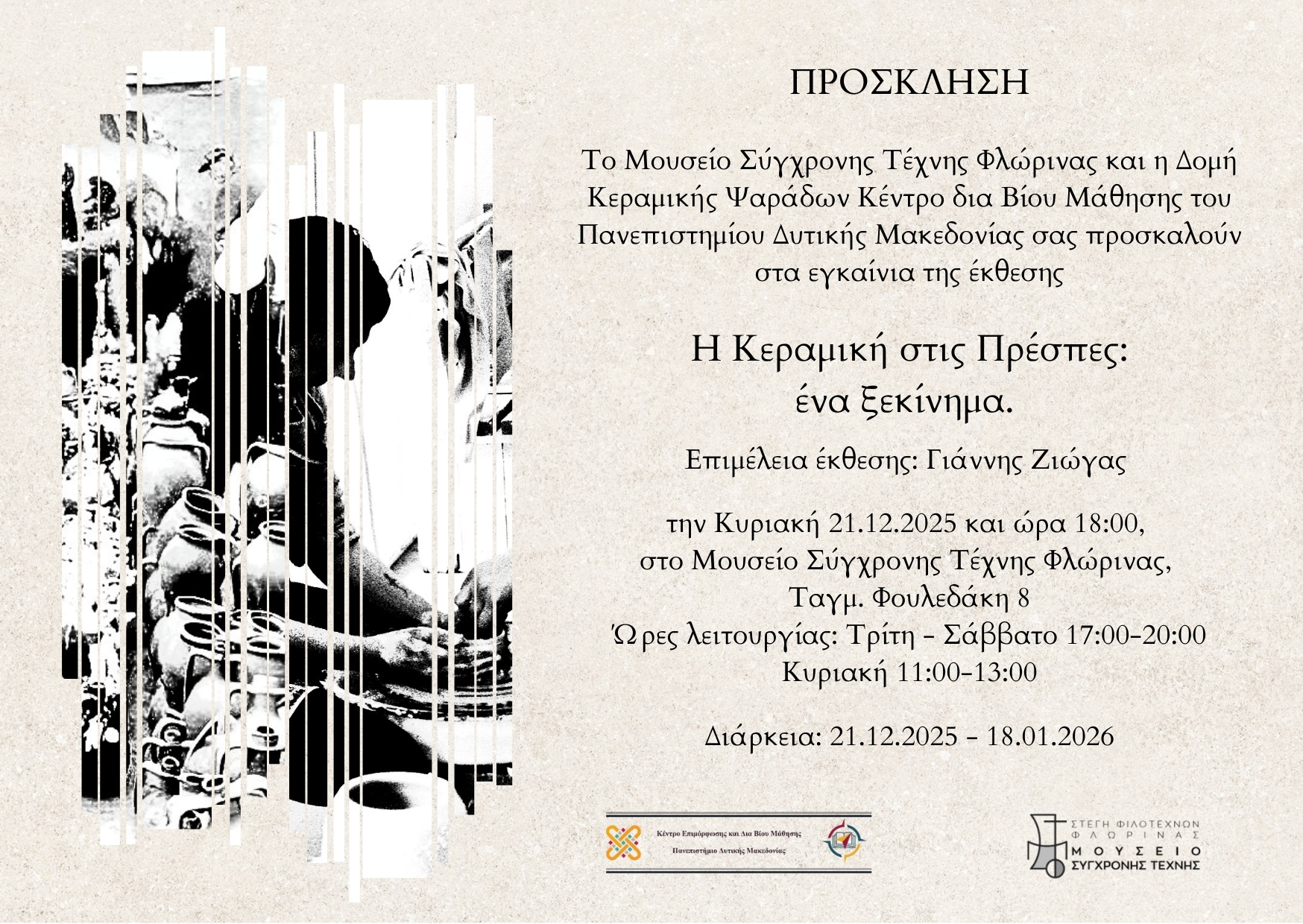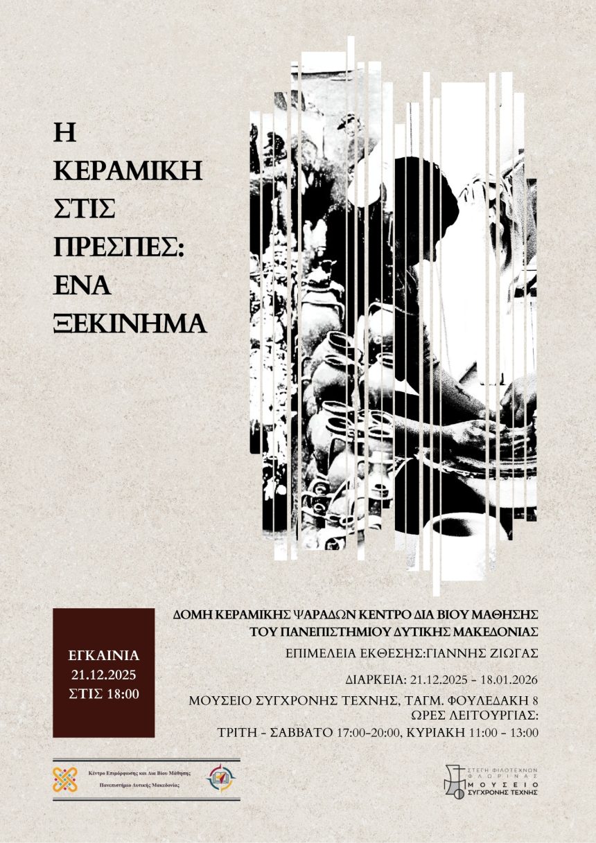 Η έκθεση Η Κεραμική στις Πρέσπες: ένα ξεκίνημα παρουσιάζει έργα των εκπαιδευόμενων που δημιουργήθηκαν στη Δομή Κεραμικής των Ψαράδων Πρεσπών, την περίοδο 2024-25, στο πλαίσιο του Προγράμματος Αναζωογόνηση των τοπικών χειροτεχνικών μονάδων ως κινητήρια δύναμη της ανάπτυξης. Το Πρόγραμμα είναι μια Δράση του Ταμείου Ανάκαμψης του Υπουργείο Πολιτισμού που υλοποιούν τα Πανεπιστήμια Δυτικής Μακεδονίας, Θεσσαλίας, Δυτικής Αττικής σε συνεργασία με τοπικούς Δήμους και φορείς.