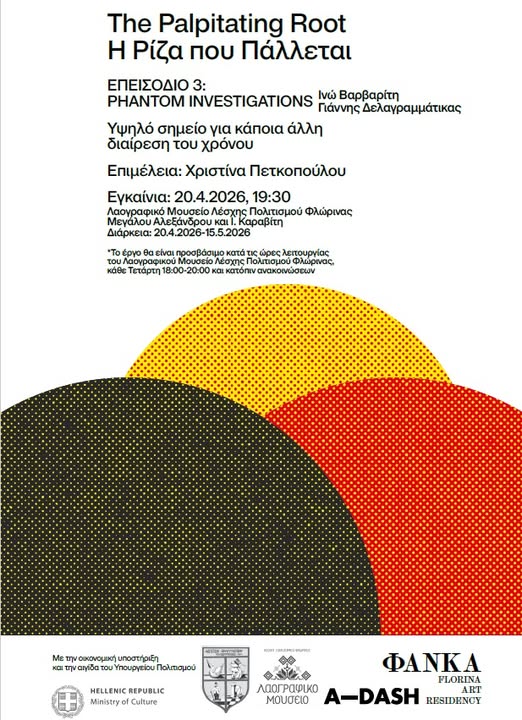 Στο πλαίσιο του τρίτου επεισοδίου του εκθεσιακού του προγράμματος με τίτλο Η Ρίζα που Πάλλεται/The Palpitating Root, το ΦΑΝΚΑ Florina Art Residency, συνεργάζεται με το Λαογραφικό Μουσείο της Λέσχης Πολιτισμού Φλώρινας όπου από τη Δευτέρα 20 Απριλίου 2026 θα φιλοξενείται το έργο Υψηλό σημείο για κάποια άλλη διαίρεση του χρόνου (2026) των Phantom Investigations (Ινώ Βαρβαρίτη, Γιάννη Δελαγραμμάτικα) σε επιμέλεια της Χριστίνας Πετκοπούλου. Το έργο θα κατοικήσει τη μόνιμη έκθεση του εκθεσιακού χώρου του Λαογραφικού Μουσείου Λέσχης Πολιτισμού Φλώρινας (Μεγάλου Αλεξάνδρου και Ι. Καραβίτη) από τη Δευτέρα, 20/4 στις 19:30 και θα είναι προσβάσιμο στο κοινό κατά τις ώρες λειτουργίας του (κάθε Τετάρτη 18:00-20:00).