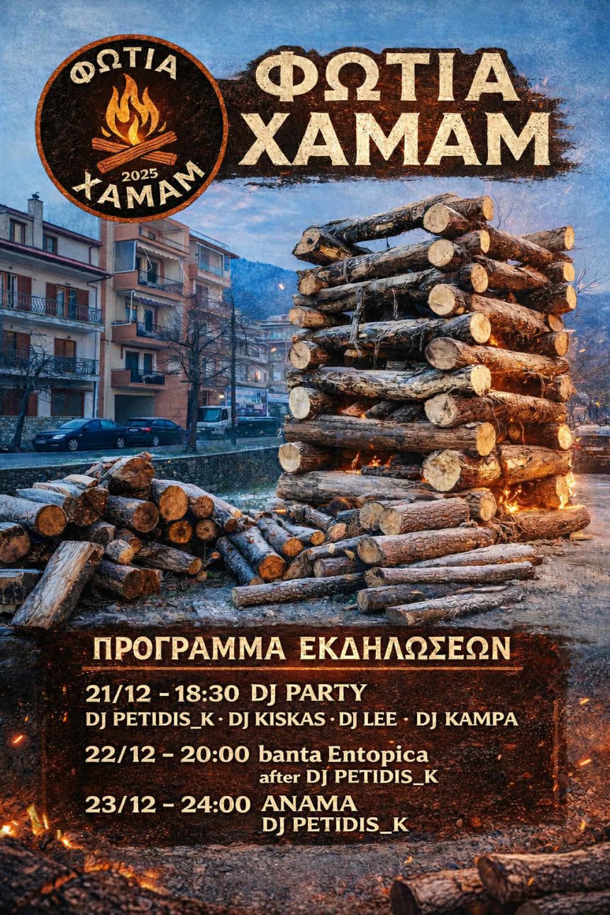 Για εμάς το άναμμα της φωτιάς δεν είναι απλώς ένα έθιμο. Είναι η πίστη ότι οι παρέες γράφουν ιστορία και για αυτό σας προσκαλούμε να γίνουμε όλοι μαζί η μεγαλύτερη παρέα της πόλης. Ελάτε για ένα αξέχαστο τριήμερο που ξεκινάει στις 21 Δεκεμβρίου από τις 18.30 με τοπικούς Djs να δίνουν τον ρυθμό με ελληνικές και ξένες μουσικές επιτυχίες σε ένα μοναδικό πάρτι για μικρούς και μεγάλους.