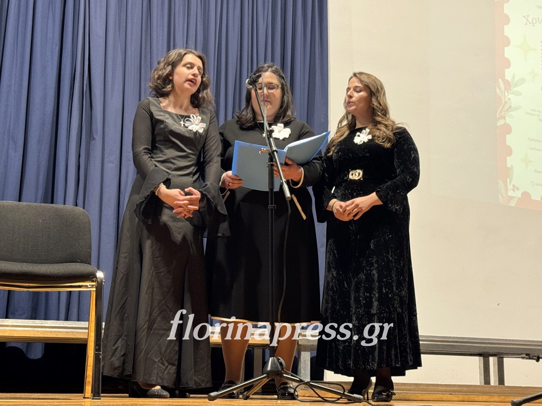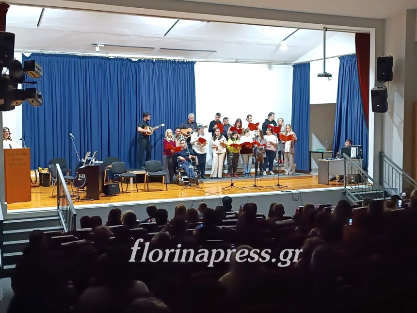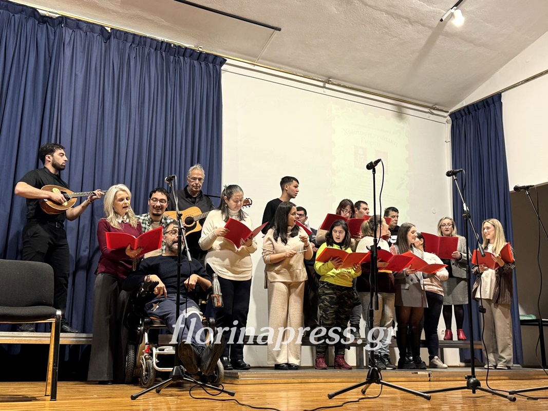 Πρώτοι στη σκηνή ανέβηκαν τα μέλη της χορωδίας του Συλλόγου Γονέων και Κηδεμόνων Ατόμων με Αναπηρία ΠΕ Φλώρινας και ΚΕΦΙΑΠ/ΓΝ Φλώρινας που παρουσίασαν Χριστουγεννιάτικα τραγούδια και χειροκροτήθηκαν θερμά από το κοινό.
