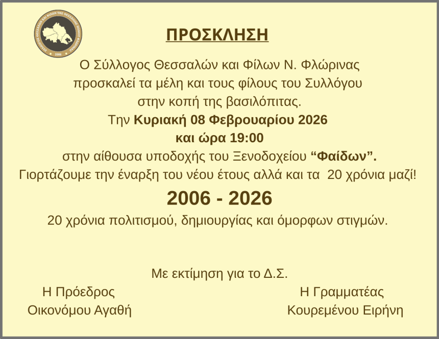 Το Δ.Σ. του Συλλόγου Θεσσαλών και φίλων Ν. Φλώρινας με χαρά προσκαλεί τα μέλη και τους φίλους του για την κοπή της βασιλόπιτας του Συλλόγου στις 8 Φεβρουαρίου 2026 στις 07:00 μ.μ. στην αίθουσα υποδοχής του Ξενοδοχείου Φαίδων – Phaidon Hotel & Spa.