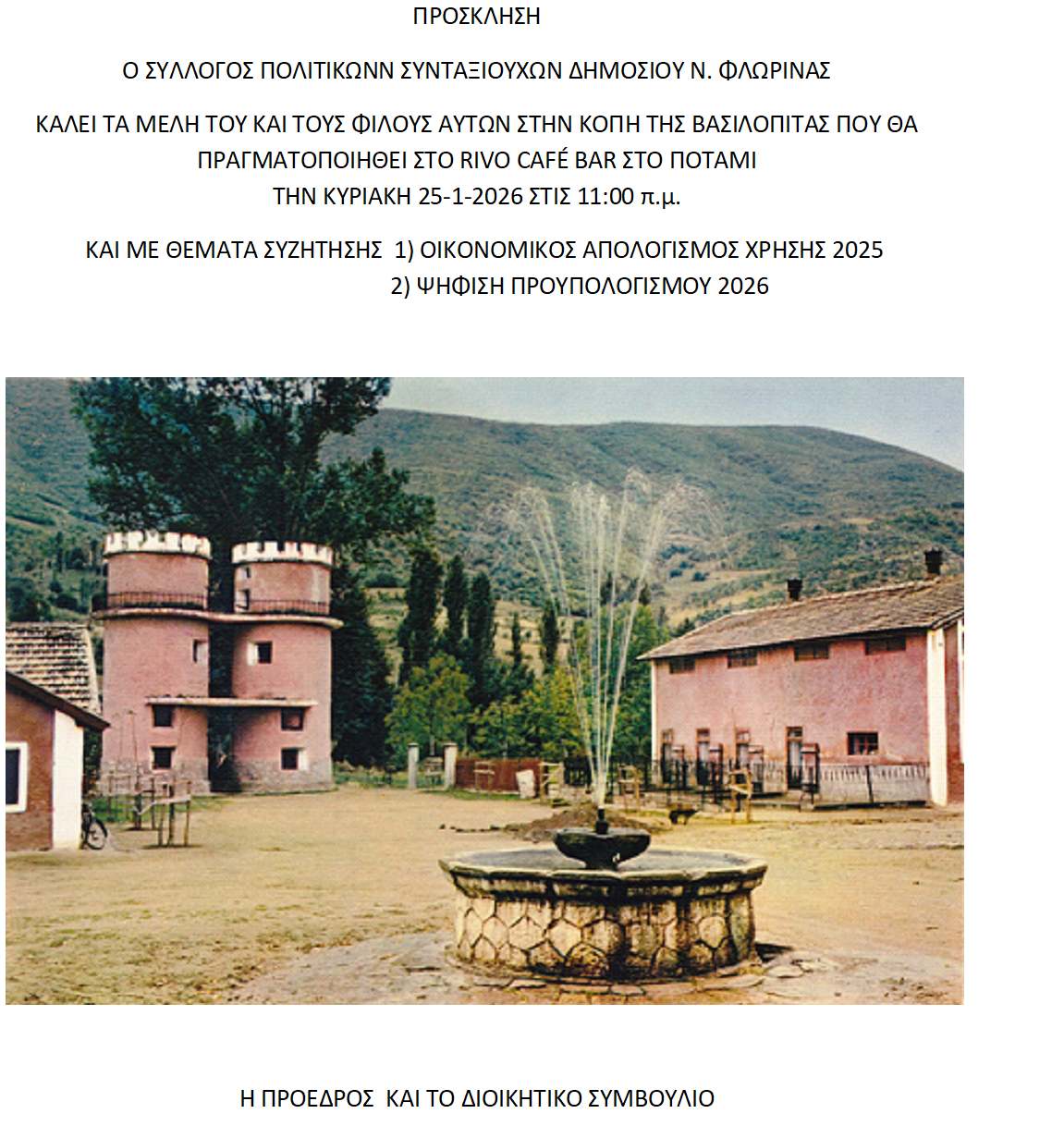 ΠολιτισμόςΚοπή βασιλόπιτας του Συλλόγου Πολιτικών Συνταξιούχων Δημοσίου Ν. Φλώρινας Σάββατο 17 Ιανουαρίου, 2026 13:46 florinapress.gr SHARE Ίσως να ενδιαφέρει ... Πρόσκληση για δημοπρασία αγρών του Εκκλησιαστικού Συμβουλίου του Ιερού Ναού Κοιμήσεως της Θεοτόκου Μεσοχωρίου Συγχαρητήριο της Ευξείνου Λέσχης Φλώρινας για την εισαγωγή τους στα πανεπιστήμια Ανακοίνωση της Π.Ε. Φλώρινας για τη λειτουργία των σχολικών μονάδων στους Δήμους Φλώρινας και Αμυνταίου ΕΚΘΕΣΗ – Για τη Φλώρινα: Αρχιτεκτονικά Τοπία του Παρελθόντος Συλλυπητήριο του συλλόγου γονέων και κηδεμόνων του 1ου ΓΕΛ Φλώρινας Share Ακολουθήστε μας8.4kFollowersLikeΤελευταία νέα Ο σύλλογος για παιδιά με καρκίνο «Η Πίστη» τίμησε τον Γρηγόρη Δημητριάδη για τη συνεισφορά του Πολιτική Σάββατο 17 Ιανουαρίου, 2026 Συγχαρητήριο του Δημάρχου Πρεσπών Γιώργου Στεργίου Κοινωνία Πολιτική Σάββατο 17 Ιανουαρίου, 2026 Περιφερειακή Ενότητα Φλώρινας: Σε δύσκολες στιγμές, η άμεση παρέμβαση κάνει τη διαφορά Κοινωνία Πολιτική Παρασκευή 16 Ιανουαρίου, 2026 Συγχαρητήριο μήνυμα του Δημάρχου Φλώρινας προς τον Διοικητή Πυροσβεστικών Υπηρεσιών Νομού Φλώρινας Κοινωνία Πολιτική Παρασκευή 16 Ιανουαρίου, 2026