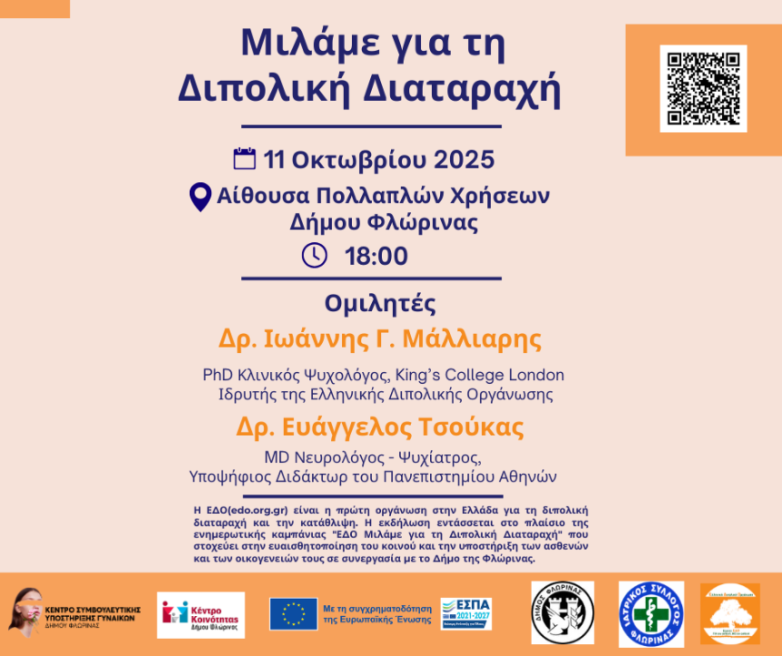Εν όψει της παγκόσμιας ημέρας για την ψυχική υγεία, ο Δήμος Φλώρινας, το Κέντρο Κοινότητας και το Συμβουλευτικό Κέντρο, διοργανώνουν δράση με στόχο την ενημέρωση και ευαισθητοποίηση της τοπικής κοινωνίας για την Διπολική Διαταραχή.