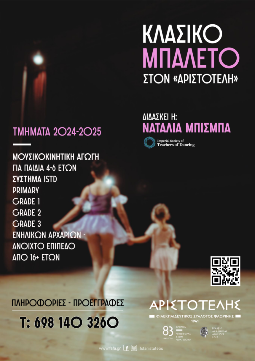 Οι εγγραφές στο τμήμα κλασικού μπαλέτου του Φ.Σ.Φ. «Ο Αριστοτέλης» θα ξεκινήσουν στις 2 Σεπτεμβρίου 2024 και θα διαρκέσουν έως τις 6 Σεπτεμβρίου τις ώρες 18:00 -20:00 στην αίθουσα χορού του Συλλόγου.