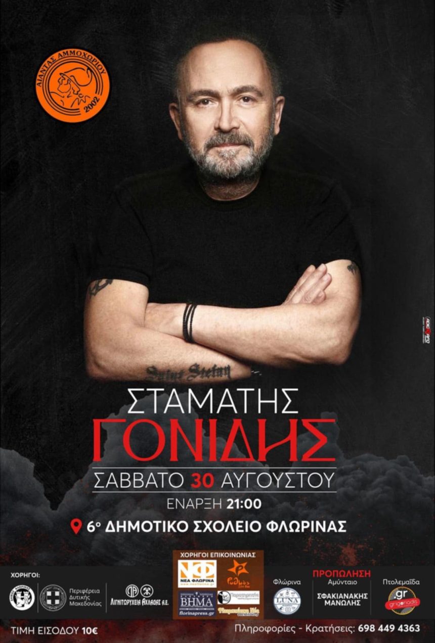 Ο Αίαντας Αμμοχωρίου σας προσκαλεί στη συναυλία του μοναδικού Σταμάτη Γονίδη, το Σάββατο 30 Αυγούστου και ώρα 21:00, στον αύλειο χώρο του 6ου δημοτικού σχολείου Φλώρινας.
