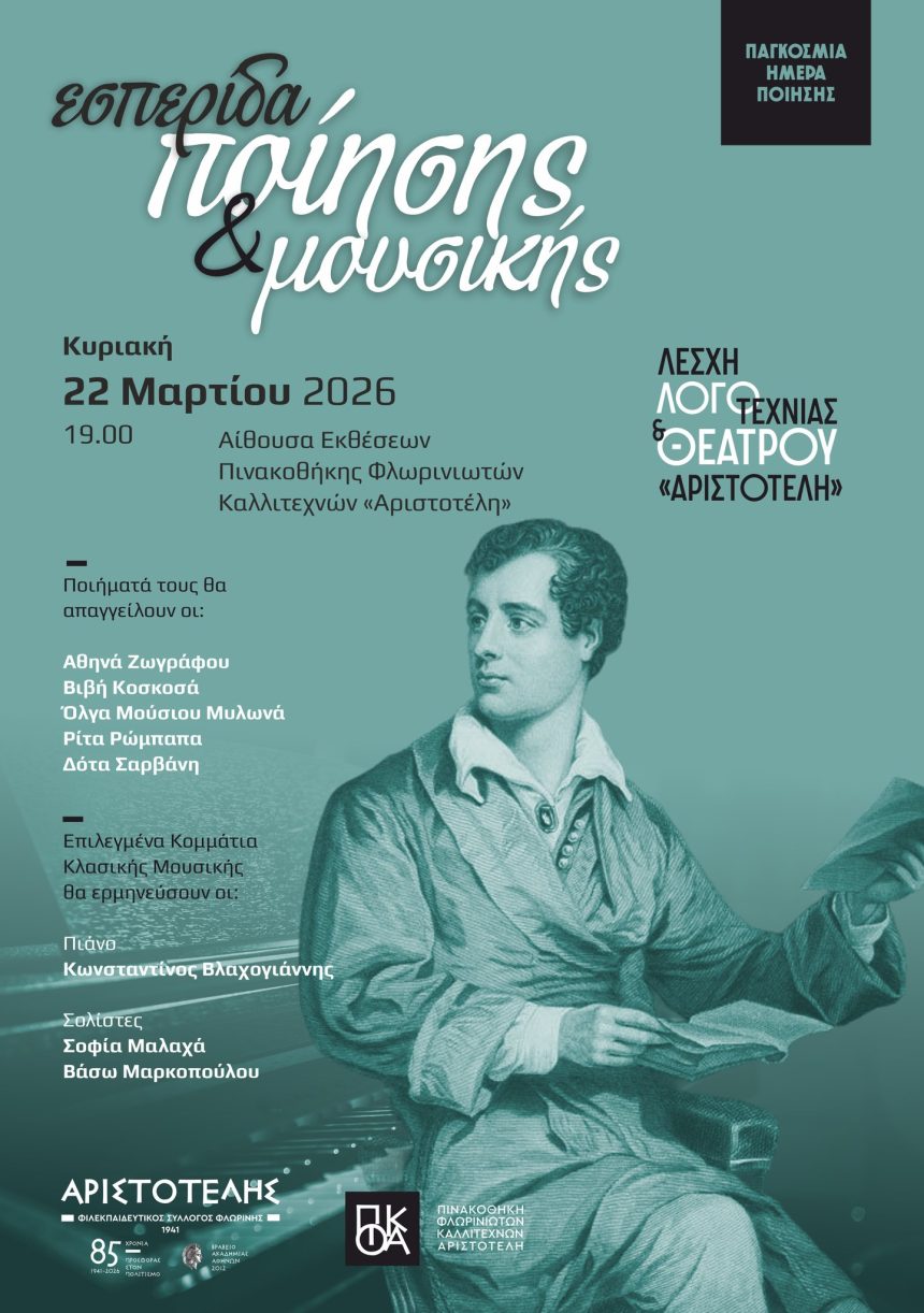 Στο πλαίσιο του εορτασμού της Παγκόσμιας Ημέρας Ποίησης η Λέσχη Λογοτεχνίας και Θεάτρου του Φ.Σ.Φ. «Ο Αριστοτέλης» διοργανώνει «Εσπερίδα Ποίησης και Μουσικής». Σε μία μεθυστική μυσταγωγία όπου η Ποίηση συναντά την Μουσική. Όπου οι δύο τέχνες συνδιαλέγονται μεταξύ τους. Κυριακή, 22 Μαρτίου 2026, στις 19.00, στην αίθουσα εκθέσεων της Πινακοθήκης Φλωρινιωτών Καλλιτεχνών του «Αριστοτέλη».