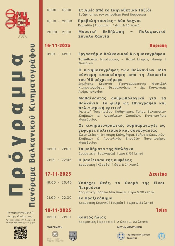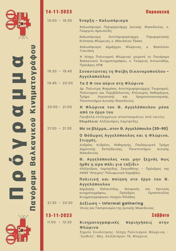 ΠολιτισμόςΠανόραμα Βαλκανικού Κινηματογράφου Τρίτη 4 Νοεμβρίου, 2025 13:09 florinapress.gr SHARE Ίσως να ενδιαφέρει ... Tο πρόγραμμα των επισκέψεων του υποψήφιου Δημάρχου Φλώρινας Βασίλη Γιαννάκη Συλλυπητήριο μήνυμα του συλλόγου Ιεροψαλτών Φλώρινας για την εκδημία του Στέφανου Δόντσιου Μία ώρα αργότερα θα ανοίξουν τα σχολεία του Δήμου Φλώρινας την Πέμπτη 10 Φεβρουαρίου Μήνυμα του Αντιπεριφερειάρχη Φλώρινας Αθανάσιου Τάσκα για την Παγκόσμια Ημέρα Αγρότισσας Συγχαρητήριο μήνυμα του Δημάρχου Φλώρινας στο νέο Δ.Σ. της Ένωσης Αστυνομικών Υπαλλήλων Φλώρινας Share Ακολουθήστε μας8.4kFollowersLikeΤελευταία νέα Αγανακτισμένοι αγρότες : Ως εδώ, η κατάσταση δεν πάει άλλο Κοινωνία Πέμπτη 4 Δεκεμβρίου, 2025 Επισκέψεις Κινητών Μονάδων Υγείας σε απομακρυσμένες Κοινότητες του Δήμου Αμυνταίου Κοινωνία Πέμπτη 4 Δεκεμβρίου, 2025 Ευχαριστήρια επιστολή του Πειραματικού Σχολείου Φλώρινας προς το Κέντρο Περιβαλλοντικής Εκπαίδευσης & Αειφορίας Μελίτης Κοινωνία Πέμπτη 4 Δεκεμβρίου, 2025 Πωλείται Γερμανικός λέβητας ξύλου Κοινωνία Πέμπτη 4 Δεκεμβρίου, 2025
