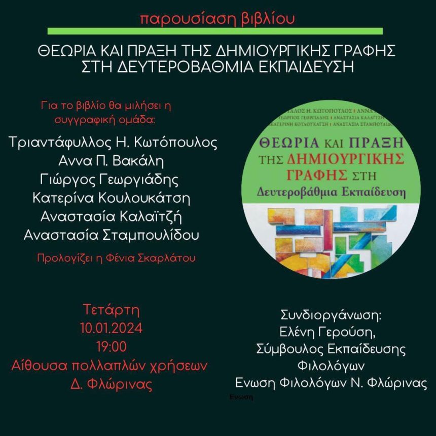 Σας προσκαλούμε στην παρουσίαση του βιβλίου «Θεωρία και Πράξη της Δημιουργικής Γραφής στη Δευτεροβάθμια ΕκπαΙδευση» που θα πραγματοποιηθεί την Τετάρτη 10.01. 2024 στις 19.00 στην Αίθουσα Πολλαπλών χρήσεων του Δ. Φλώρινας.