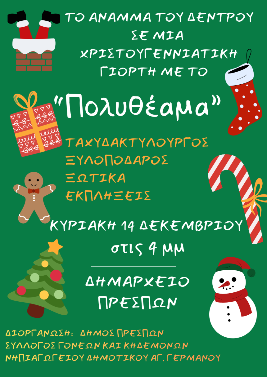 Την Κυριακή 14 Δεκεμβρίου 2025, στις 4 το απόγευμα, έρχονται στην αυλή του Δημαρχείου Πρεσπών, μία εντυπωσιακή χριστουγεννιάτικη γιγάντια μασκότ, ο μοναδικός φωτεινός ξυλοπόδαρος του κόσμου, ένας ταχυδακτυλουργός που μαγεύει με τα κόλπα του και τα πιο σκανδαλιάρικα ξωτικά, για να προαναγγείλουν τα Χριστούγεννα μ’ ένα ξέφρενο πάρτι για όλα τα παιδιά.