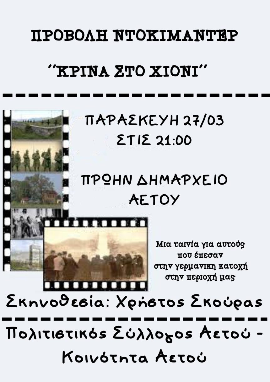 Ο Μορφωτικός Πολιτιστικός Σύλλογος Αετού και η Κοινότητα Αετού προβάλλουν την Παρασκευή 27/03 μια μέρα πριν την 82η επέτειο από την εκτέλεση 13 συντοπιτών μας, στην πλειονότητα κατοίκων του Αετού, το ιστορικό ντοκιμαντέρ του Χρήστου Σκούρα ΄΄ Κρίνα στο Χιόνι ΄΄.
