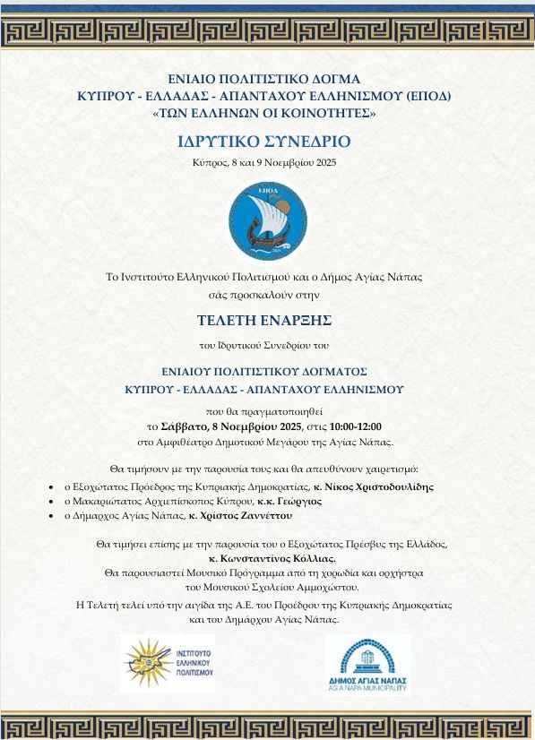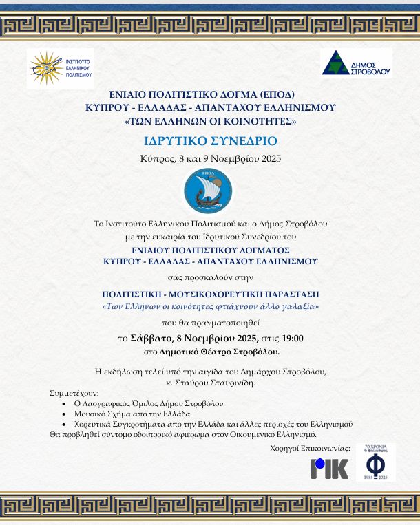 Το Ιδρυτικό Συνέδριο του Ενιαίου Πολιτιστικού Δόγματος ( ΕΠΟΔ ) θα πραγματοποιηθεί στην Κύπρο στις 8 και 9 Νοεμβρίου 2025. Την ευθύνη οργάνωσης του Συνεδρίου έχει το Ινστιτούτο Ελληνικού Πολιτισμού Κύπρου, ως ο φορέας που εμπνεύσθηκε και που ανέλαβε να σηκώσει το βάρος υλοποίησης του εν λόγω μεγαλόπνοου οράματος.