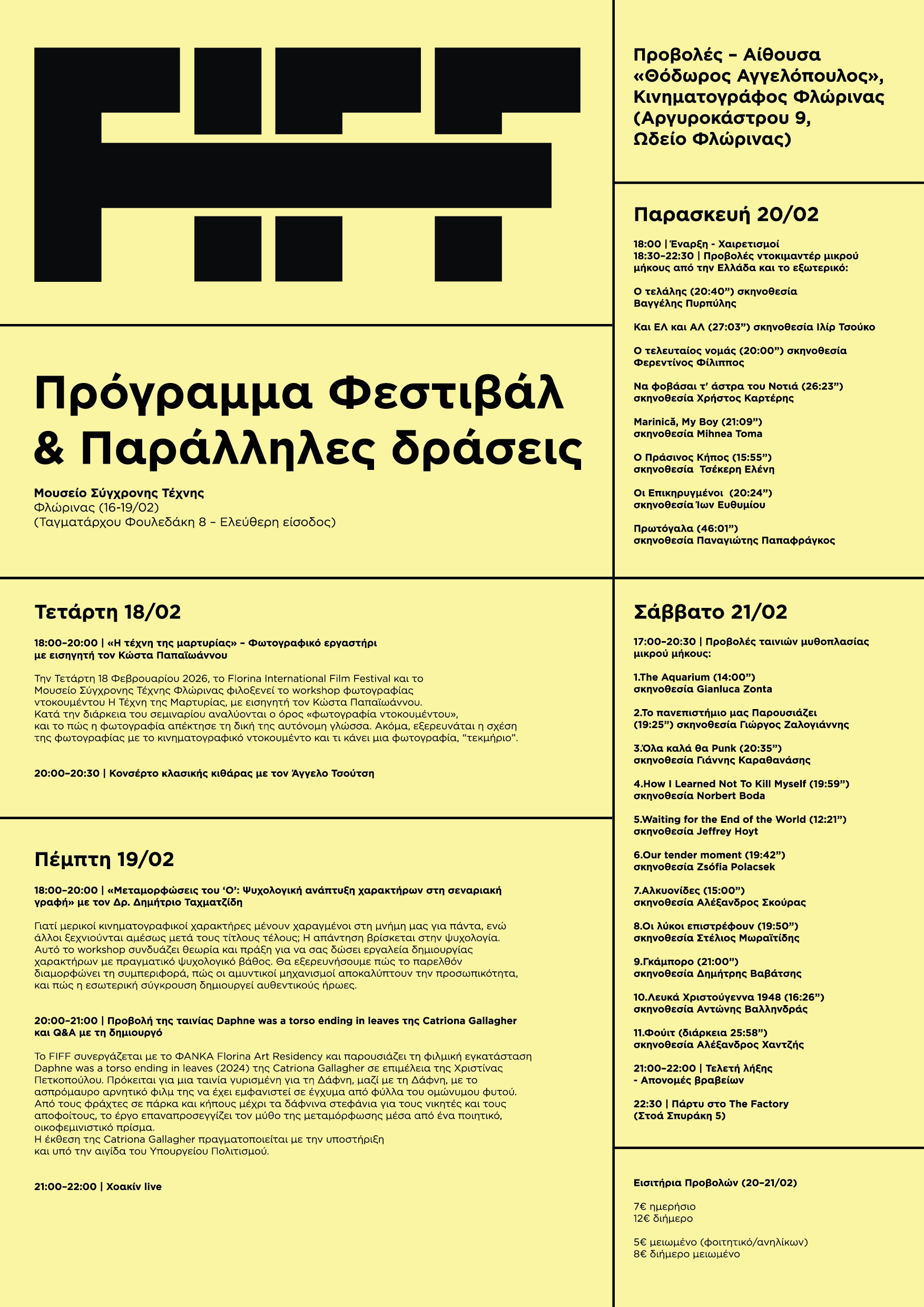 Η Indie Beats AMKE σε συνεργασία με την Περιφέρεια Δυτικής Μακεδονίας – ΠΕ Φλώρινας και τον Δήμο Φλώρινας, τη Λέσχη Πολιτισμού Φλώρινας και τη Στέγη Φιλοτέχνων Ν. Φλώρινας, διοργανώνει για πρώτη φορά το Florina International Film Festival, ένα νέο διεθνές κινηματογραφικό θεσμό αφιερωμένο στην ταινία μικρού μήκους, που θα πραγματοποιηθεί από τις 18 έως τις 21 Φεβρουαρίου 2026.