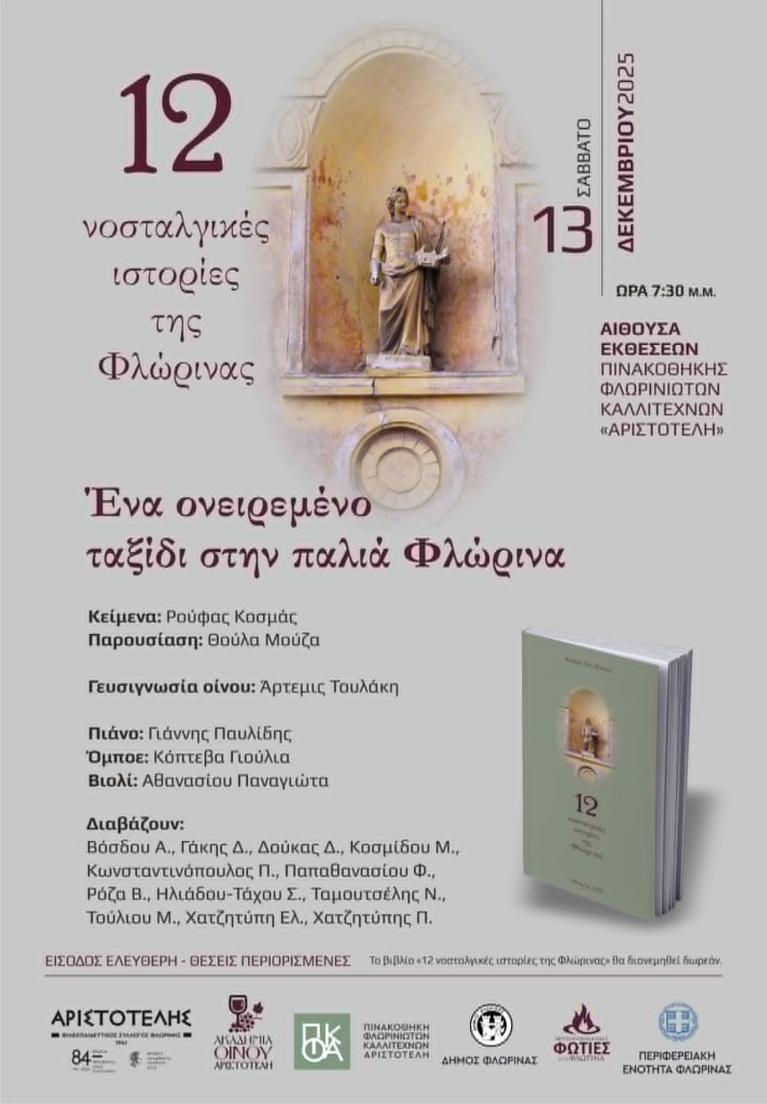 Η Ακαδημία Οίνου Αριστοτέλη, σας προσκαλεί σε μια μοναδική βραδιά, με τίτλο, ‘’12 Νοσταλγικές Ιστορίες της Φλώρινας’’, το Σάββατο, 13 Δεκεμβρίου 2025 και ώρα 7.30 μ.μ. στην Πινακοθήκη Φλωρινιωτών Καλλιτεχνών του Φ.Σ.Φ. ‘’Ο ΑΡΙΣΤΟΤΕΛΗΣ’’, στην Φλώρινα.
