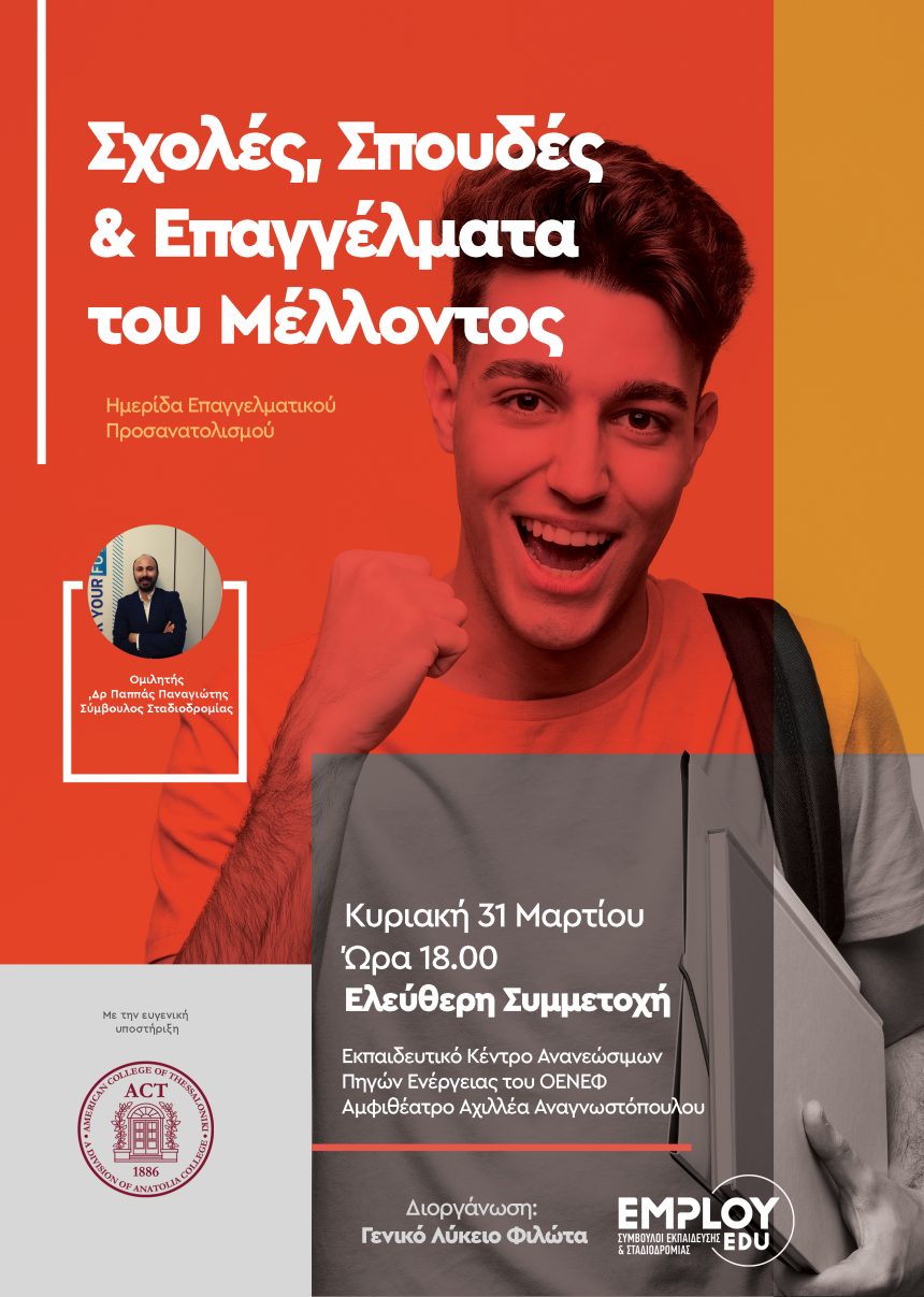 Ωστόσο, τις περισσότερες φορές η επιφανειακή ενημέρωση και οι διάσπαρτες πληροφορίες οδηγούν σε εσφαλμένες αντιλήψεις. Κατανοώντας, λοιπόν, τη σπουδαιότητα μιας τέτοιας απόφασης και διαδικασίας, το ΓΕΝΙΚΟ ΛΥΚΕΙΟ ΦΙΛΩΤΑ διοργανώνει ανοιχτή ημερίδα Επαγγελματικού Προσανατολισμού σε συνεργασία με τη διακεκριμένη και ηγετική – στον κλάδο της – επιστημονική ομάδα της EMPLOY EDU Σύμβουλοι Εκπαίδευσης & Σταδιοδρομίας. Ομιλητής της παρούσας εκδήλωσης θα είναι ο Δρ Παππάς Παναγιώτης, Σύμβουλος Σταδιοδρομίας.