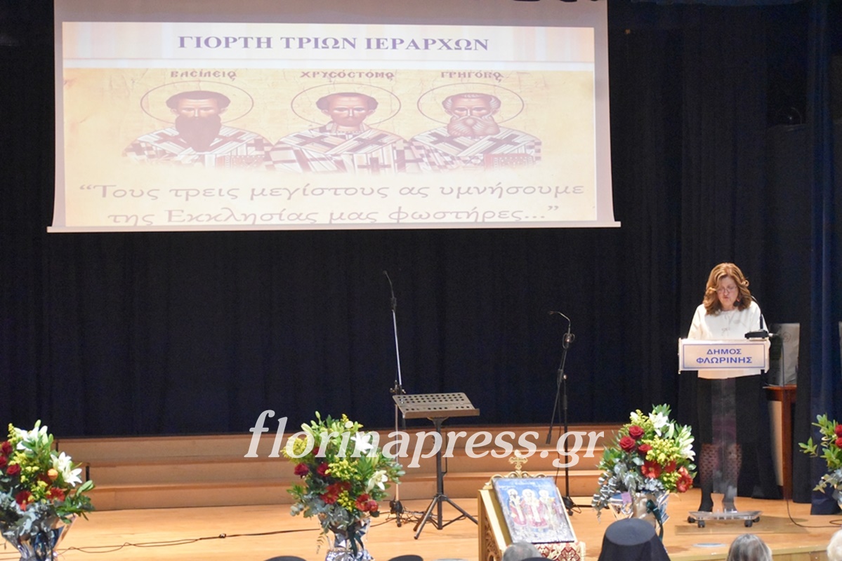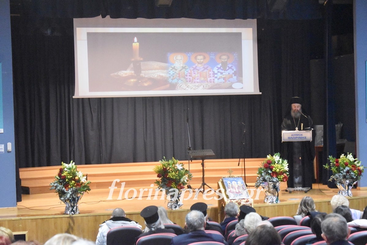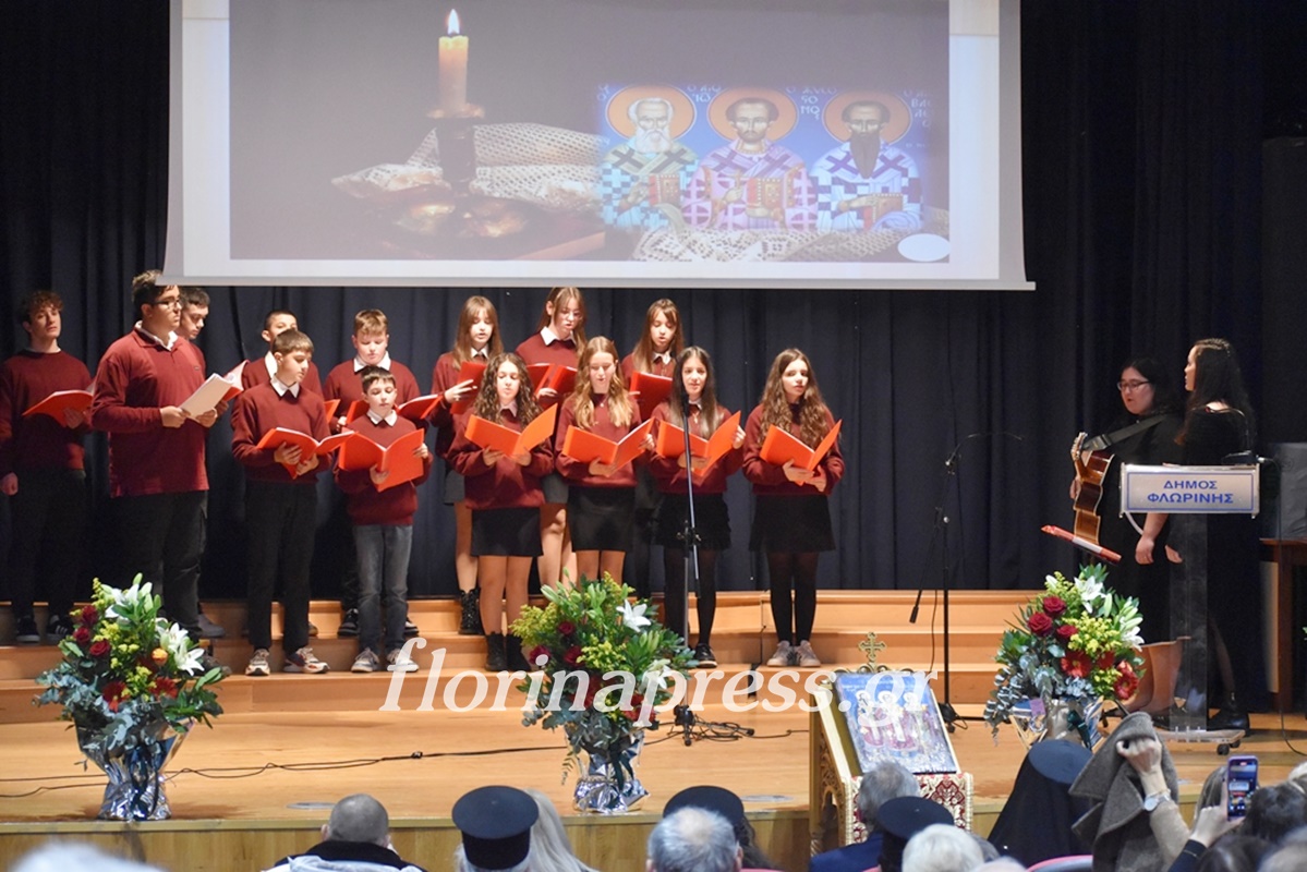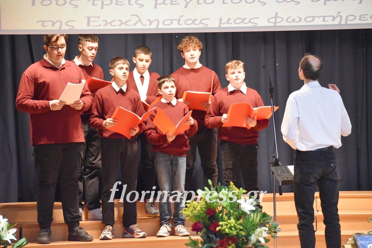 Την εκδήλωση παρουσίασε η Διευθύντρια του Πρότυπου Εκκλησιαστικού Σχολείου Γυμνασίου και Λυκείου Φλώρινας «Άγιος Αγαθάγγελος», κα Ευαγγελία Ρίζου. Στο πλαίσιο της εκδήλωσης, μαθητές και μαθήτριες του Εκκλησιαστικού Σχολείου ανέγνωσαν αποσπάσματα από κείμενα των Τριών Ιεραρχών και απέδωσαν ύμνους προσδίδοντας πνευματικό περιεχόμενο και υπογραμμίζοντας τη διαχρονική σύνδεση της παιδείας με το ήθος, την καλλιέργεια και τον σεβασμό προς τον άνθρωπο. Η συμμετοχή τους ανέδειξε έμπρακτα τη συνέχεια της παιδαγωγικής παράδοσης και τη ζωντανή σχέση μεταξύ των γενεών.