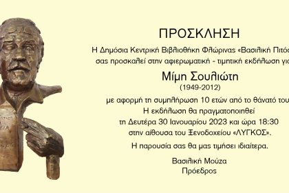 Η Δημόσια Κεντρική Βιβλιοθήκη Φλώρινας «Βασιλική Πιτόσκα», σας προσκαλεί στην αφιερωματική –…