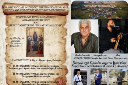 Τετραήμερες Λατρευτικές και Πολιτιστικές Εκδηλώσεις για τον εορτασμό της Κοιμήσεως της Θεοτόκου και την Ιερά Πανήγυρη της Παναγίας Λάλογλη στο Μεσονήσι Φλώρινας