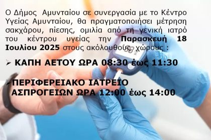 Ενημερωτική δράση Δήμου Αμυνταίου για την πρόληψη και την ευαισθητοποίηση για το σακχαρώδη διαβήτη, σε Αετό και Ασπρόγεια